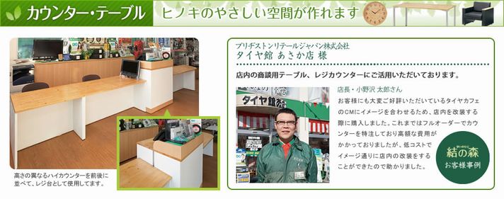 「お客様にも大変ご好評いただいているタイヤカフェのCMにイメージを合わせるため、店内を改装する際に購入しました。これまでフルオーダーでカウンターを特注しており高額な費用がかかっておりましたが、低コストでイメージ通りに店内の改装をすることができたので助かりました。」
