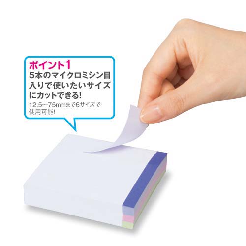 幅広タイプと細いタイプが共存!?技ありの正体は・・・ミシン目です!『ミシン目入ふせん』には12.5mm間隔でミシン目が入っています。12.5mmから75mmまで6サイズが自由自在。つまり、好きなサイズでカットして使用できるんです。これって、ステキでしょ?もう異なるサイズのふせんを使い分ける必要がなくなるんですから!