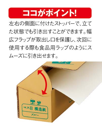 『手切れできるミシン目入りマス目模造紙』はロールタイプの箱入り、持ち運びもラクラクです。左右につけたストッパーで、箱を立てた状態でも模造紙を引き出すことができます。保管にスペースは必要ありません。さらに、次回使用する際も、食品用ラップのようにスムーズに引き出すことができるのです。まさに技あり!さすが、カウネットですね~!